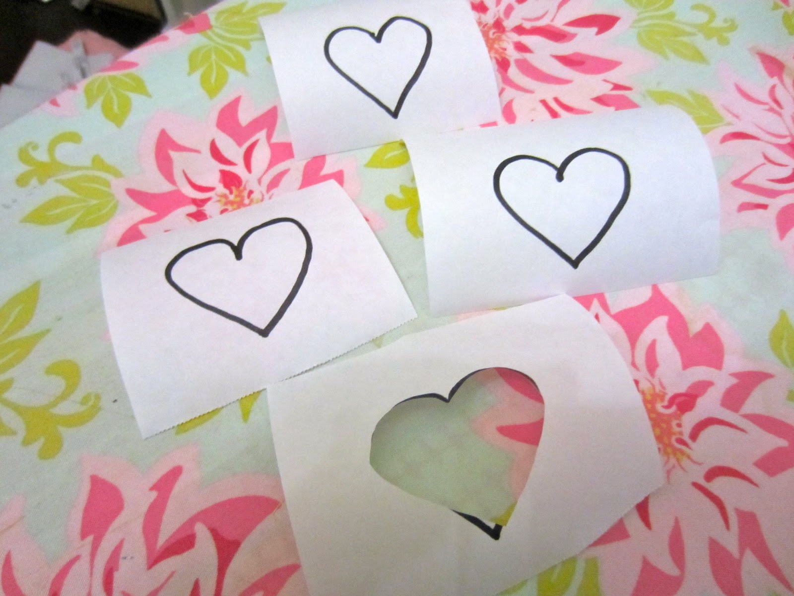 Step 3: Cut 4 squares of freezer paper, about 4" and draw a heart in the center. You can just do one if you plan on making these one at a time, having four helps if you want to do assembly line production. Now cut out the hearts, worrying about leaving the frame intact, not the heart. You can discard the heart centers.